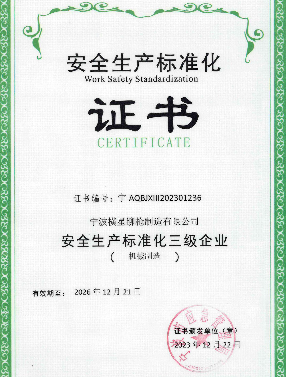 机械安全生产标准化证书